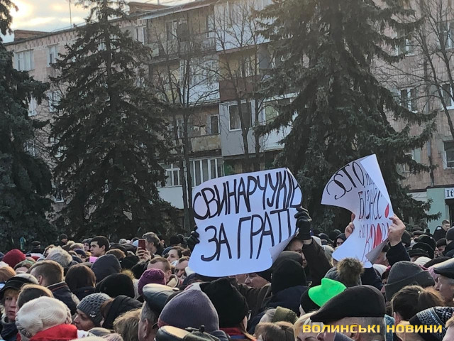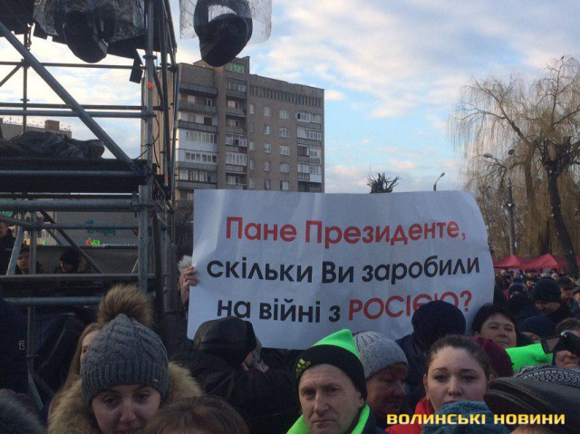 Волиняни на зустрічі з Петром Порошенком в Ковелі принесли банери з питаннями «Свинарчуків за ґрати», «Хто покриває бізнес на крові?» та цікавляться, скільки президент заробив на війні з Росією.