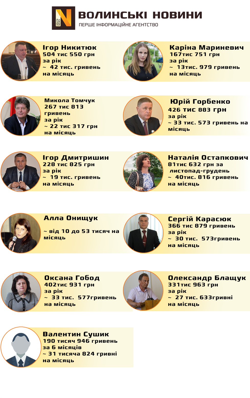 Директор департаменту фінансів Ігор Никитюк протягом минулого року отримав 113,837 тисячі як оклад, 6,567 тис. грн надбавки за ранг, 56,918 тис. як надбавку за вислугу років. Крім того, 109,627 тис. як надбавку за інтенсивність праці, 8,925 тисячі за доступ до державної таємниці, 87,351 тис. як премію, 121,323 тис. – інші виплати (у тому числі, матеріальна допомога для вирішення соціально-побутових питань – 33,109 тис., грошова допомога – 35,44 тисячі). Загалом протягом 2018 року чиновник отримав 504,55 тисячі гривень. У 2017 році, відповідно до річної декларації, він заробив 269,658 тисячі або на 234 тис. менше, у 2016 році – 167,945 тис., у 2015 році – 85,759 тис.Начальник служби у справах дітей Алла Онищук протягом минулого року отримувала від 10,547 тисячі до 53,586 тисячі гривень на місяць. Так, у лютому 31,15 тисячі вона отримала як матеріальну допомогу, у жовтні – 19,025 тис. До 3,7 тисячі на місяць становили надбавки за інтенсивність праці.Начальник управління з питань оборонної роботи та взаємодії з правоохоронними органами Валентин Сушик отримав протягом липня-грудня 2018 року 190,946 тисячі гривень. До прикладу, у вересні він отримав 50,383 тис., у жовтні – 45,195 тис. Протягом року чиновник отримав матеріальну допомогу у сумі 52,412 тисячі гривень, надбавку за інтенсивність парці у розмірі 30,681 тис. У 2017 році Валентин Сушик, відповідно, отримав 188,236 тисячі, у 2016 році – 47,81 тис.