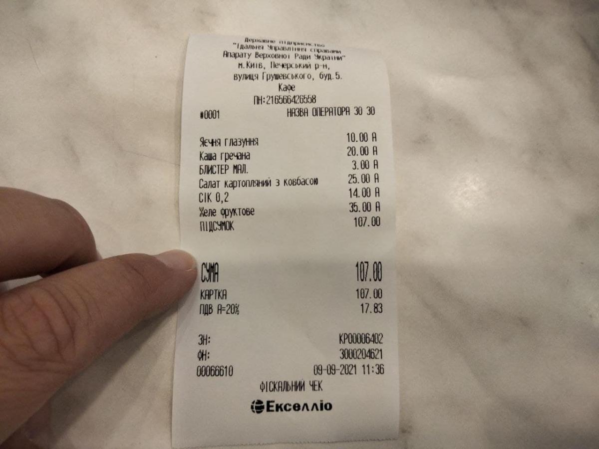 В їдальні Верховної Ради можна пообідати й бюджетно. Доказ - чек кореспондента УНІАН, який обрав недорогі позиції в депутатському меню.