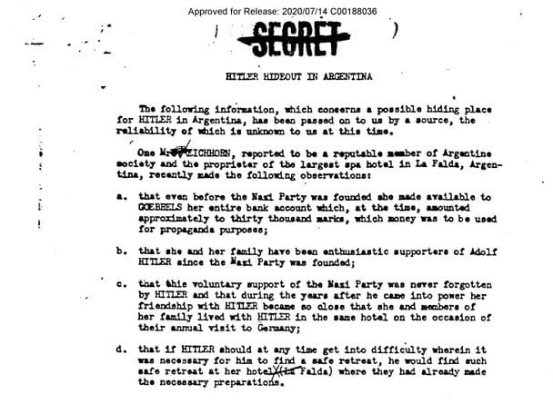 Один із документів ЦРУ від жовтня 1955 року описує секретну операцію в Колумбії, де інформатор повідомив, що знайомий із колишнім есесівцем, який особисто бачив Гітлера. Знайти вождя нацистів не вдалося, але з’явилося припущення, що він залишив Колумбію і перебрався до Аргентини в січні 1955 року.Розсекречений документ ЦРУ