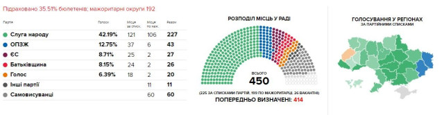 За даними на ранок, ЦВК опрацювала 35,51% бюлетенів. Згідно із підрахунками, «Слуга народу» набирає 42,19% голосів і отримує 121 місце за списками і 106 місць по мажоритарних округах (загалом – 227).