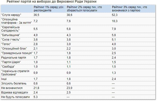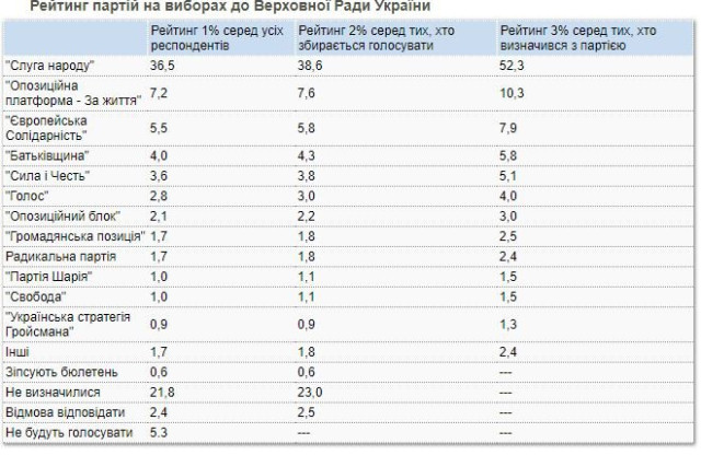 Рейтинг партії «Слуга народу» перед виборами до парламенту росте і вже перевищує 50%. Також до Верховної ради, згідно з опитуванням, проходить політична партія Ігоря Смешка «Сила і честь», натомість партія Святослава Вакарчука «Голос» не долає п’ятивідсотковий виборчий бар’єр.