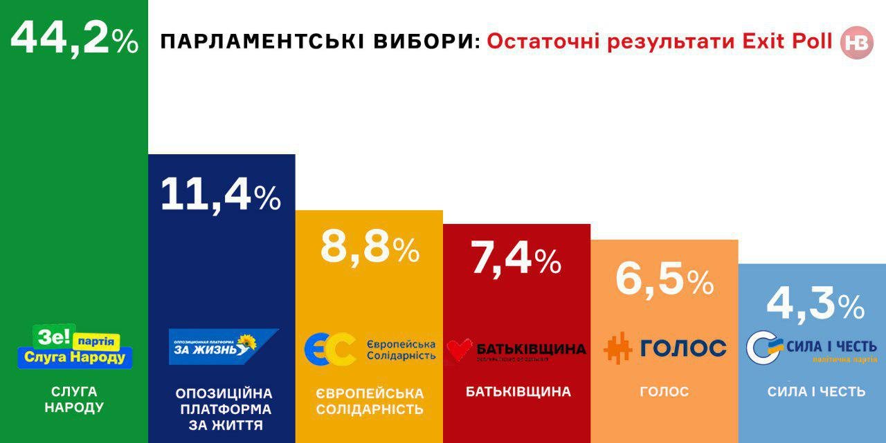 Так, за партію «Слуга народу» проголосували 44,2% виборців, за партію «Опозиційна платформа – За життя» – 11,4%, за партію «Європейська солідарність» – 8,8%, за партію «Батьківщина» – 7,4%, за партію «Голос» – 6,5% виборців.
