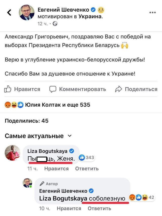 Полярность политической позиции одной и той же партии порой удивляет. С одной стороны такие депутаты, как Евгений Шевченко поздравляют Лукашенко с победой, Дубинский высказывается традиционно на тему "улицы", а с другой стороны...Богуцкая, Кравчук, Мариковский и иже с ними. Елизавета Богуцкая вообще пришла к коллеге Шевченко под пост с возмущённым комментарием.