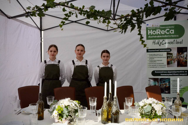 «Щиро дякую за надану можливість зустрітися з вами, побувати на цьому прекрасному дійстві, привітати і учнівський, і педагогічний колектив із такою чудовою подією. Насправді коледж НУХТ – перший навчальний заклад на Волині, який протоптав стежину в рамках Програми Еразмус+. Цей проєкт дозволив здобувачам освіти і працівникам навчального закладу вивчати міжнародний досвід, здійснювати обмін, проводити стажування, готувати різноманітні методичні матеріали, які стануть у пригоді при підготовці кваліфікованих спеціалістів і молодших фахових бакалаврів. Сподіваюся, що кожен дотичний до цього проєкту отримав корисний досвід. Сподіваюся, що попереду – нові цікаві проєкти та досягнення», – зазначила директорка Навчально-методичного центру професійно-технічної освіти у Волинській області Зоя Парфенюк.Менеджерка проєкту Лариса Тарасюк розповіла, що на фестивалі представлено вісім тематичних локацій.Це Game Zone – локація з екозабавами та конкурсами; Green Skills Journey – EcoYouth Volyn – локація про пригодницькі тури для молоді та акції на захист природи; «Смак України: скарби автентичної кухні» – локація з традиційними українськими стравами та кулінарними секретами наших предків, де можна спробувати автентичні смаколики та дізнатися історії їх походження; Pumpkin Zero Waste Zone – локація з майстеркласами з приготуванням страв з гарбуза, де використовуються всі його частинки, без залишків; «Інновації для сталого розвитку HoReCa» – локація з лекціями від експертів про впровадження сталих практик у сфері гостинності і сервіровку бенкетного столу; Zero Waste Bar – локація приготування напоїв із дотриманням екологічних принципів; Green Taste Colors – локація про харчові барвники; локація цифровізації HospitARity Hub. Мандрівка у реальність+.Студент коледжу Данило представляв на фестивалі локацію Green Taste Colors. Тут відвідувачі могли на практиці пізнати різницю між натуральними й синтетичними харчовими барвниками. Для гостей підготували желейні цукерки, виготовлені з використанням обох типів барвників. Спробувавши смаколики, відвідувачі голосували за той смак, який сподобався більше.
