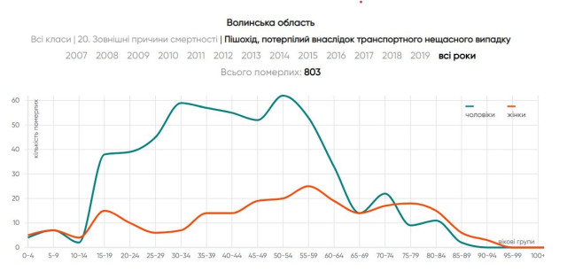 Найбільше летальних випадків, внаслідок аварій, зафіксували у Луцьку – 159 (19,8%). Загалом же по області серед загиблих в ДТП пішоходів значно більше чоловіків – 565 (70%), жінок – 238 (30%). Майже 7% загиблих пішоходів – діти.Динаміка смертності пішоходів у ДТП на Волині за 2007-2019 роки та в розрізі районівСтатево-вікова структура смертності, загиблих в ДТП пішоходів на Волині у 2007-2019 роках