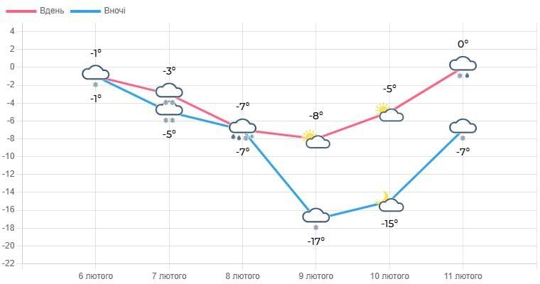 У вівторок, 10 лютого, буде мінлива хмарність. Без опадів. Вітер південно-східний, 3-8 м/с. Температура вночі становитиме 13-18° морозу, а вдень – 3-8° морозу.