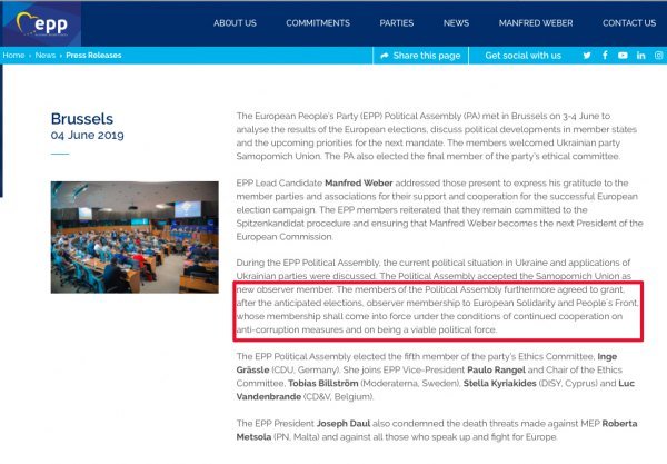 Тобто членства цим партіям не надавали, і навіть про вересень не мовиться. Членство можливе лише за певних умов, де одна з ключових – боротьба з корупцією.Повідомлення на сайті Європейської народної партії