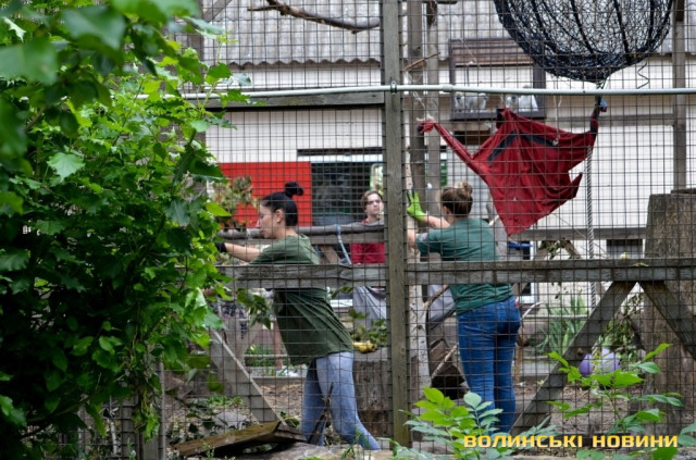 «Приміром, гризуни не вельми люблять сонце й живуть в нірках. Тому у вольєри для таких тварин ми ставимо багато зелені. Ці природні декорації створюють багато тіні. У клітці з куницями є пеньки з дірками, в яких вони відпочивають. А теплолюбові папуги просто обожнюють сонечко. Але ми однаково ставимо будиночки в клітках, аби вони мали ще й трохи затінку. Для цього використовуємо екологічно чистий матеріал. Їхні будиночки накриті корою дерев, бо в природі вони цю кору дзьобають і трощать. Вовки люблять прохолоду, тому їхні вольєри розміщені таким чином, щоб потрапляло сонячне проміння на них по мінімуму. Відповідно, клітки з цими тваринами – в спеціальному ряду під великими деревами, які дають затінок. Віслюки живуть на сонці, оскільки це східні тварини і вони його дуже полюбляють. І верблюди теж», – каже ветлікар.