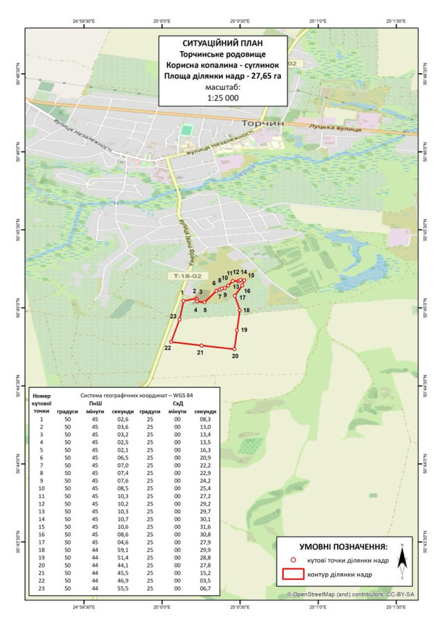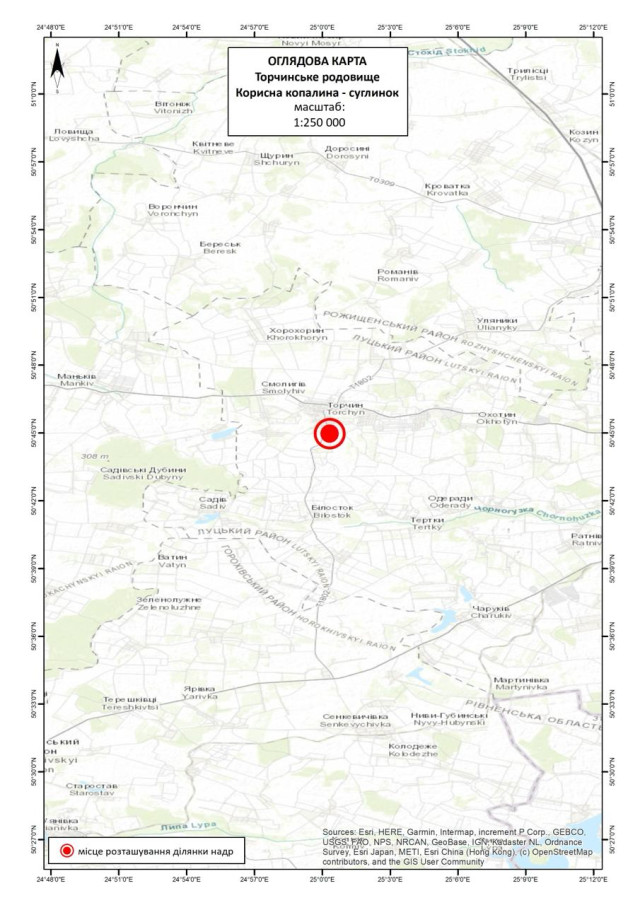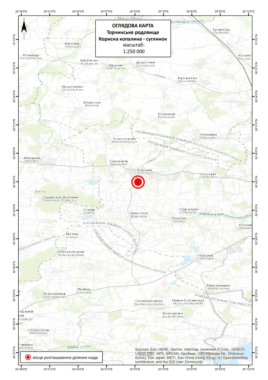 «Торчинське родовище суглинку розташоване на південно-східній околиці Торчина Луцького району Волинської області, безпосередньо біля південної межі промислового майданчика Торчинського цегельного заводу. Від обласного центру і залізничної станції «Луцьк» родовище розташоване за 25 кілометрів на захід і має з ним сполучення по автомагістралі Луцьк–Володимир. Уздовж західної межі родовища на відстані 50 метрів проходить автодорога Торчин–Білосток», – вказано в описі лоту.
