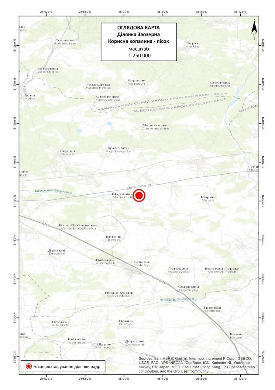 Ділянка Заозерна розташована на території Ковельського району Волинської області, на відстані 2,3 км на північний захід від села Шкурат.Вид корисної копалини – пісок.