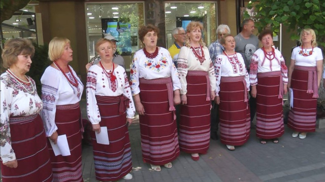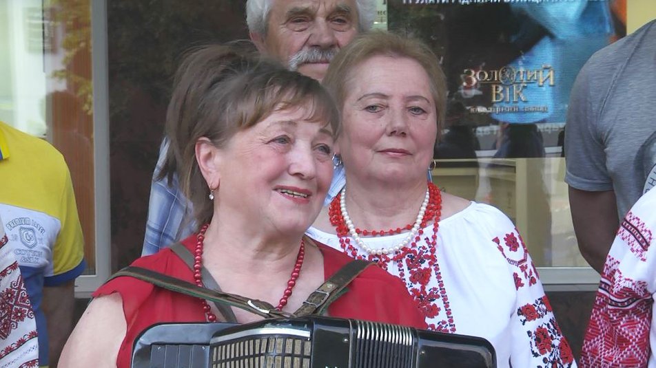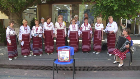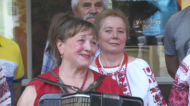 Учасники народного ансамблю «Джерела Волині» грають і співають на пішохідній вулиці Лесі Українки в Луцьку патріотичні пісні.