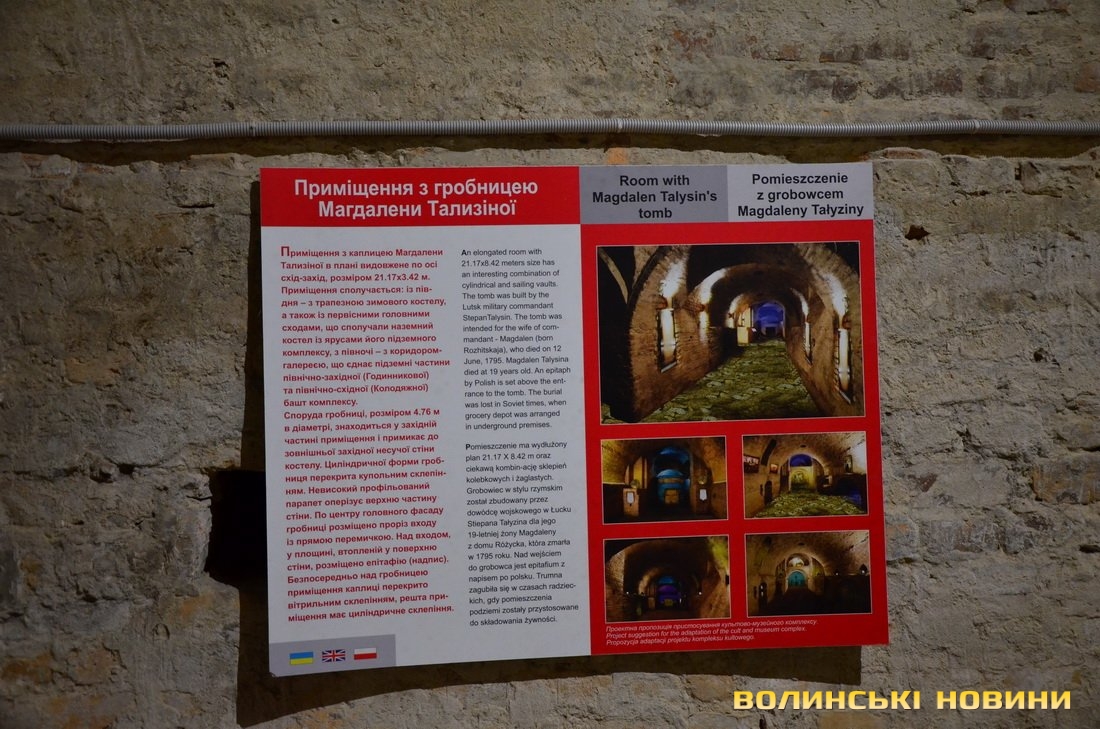 Нещодавно теж було проведено електроосвітлення, відкрито нові коридори-галереї, які дозволили збільшити площу для проведення екскурсій і подальших наукових досліджень, встановлено східці та поручні для зручного пересування підземеллям, оновлено виставку керамічних матеріалів, знайдених під час досліджень, встановлено інформаційні таблиці, присвячені видатним діячам Луцької дієцезії та фрескам, оригінали яких знаходяться в сакристії костелу, оздоблено вівтар нижнього храму, встановлено великоформатні зображення репродукцій відомих художників, зокрема Мікеланджело Караваджо, Леонардо да Вінчі та Дієго Веласкеса, розміщено барельєф «Мадонна з немовлям» (репродукцію скульптури Мікеланджело) у гробниці Магдалени Тализіної.«Ми зібралися сьогодні для того, аби офіційно відкрити прекрасний туристичний маршрут – луцькі підземелля. Окрім того, ця подія особлива й тим, що ми хочемо вшанувати пам'ять нашого відомого краєзнавця, ентузіаста Олега Виноградова, завдяки якому підземелля вдалося почати розчищати, аби вони стали доступними для відвідувачів», – привітав усіх присутніх директор Державного історико-культурного заповідника в Луцьку Павло Рудецький.Він зауважив, що для відновлення підземелля й для того, аби відвідувачі могли перебувати під землею довше, було проведено колосальну роботу, зокрема працівники заповідника відкрили всі шахти та продухи, що дозволило просушити повітря й значно підвищити температуру в середині коридорів і залів. Своєю чергою, освітлити підземелля вдалося завдяки облраді, яка виділила з цієї метою 350 тисяч гривень із обласного бюджету.