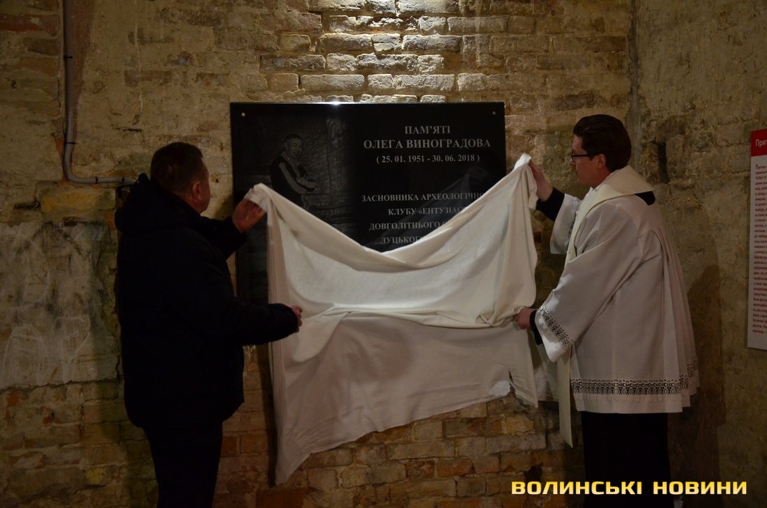 Згадками про особисті знайомства та вагому працю Олега Виноградова, а також спогадами про перші візити до підземелля поділилися краєзнавець, професор, голова Волинської обласної організації Національної спілки краєзнавців України Геннадій Бондаренко, заступник директора з наукової частини адміністрації Державного історико-культурного заповідника Віктор Баюк, заступниця Луцького міського голови Ірина Чебелюк, архітектор Микола Головань, директорка Волинського краєзнавчого музею Оксана Важатко, фотохудожник Віктор Чухрай тощо.Настоятель кафедрального костелу Святих Апостолів Петра і Павла, отець-канонік Павло Хом’як освятив пам’ятну таблицю, присвячену Олегу Виноградову.Він теж пригадав часи, коли в підземеллі було багато непотребу та цегли, а скрізь валялися розкидані людські кістки.«Святий Йоан Павло ІІ, у світі знаний як Кароль Войтила, писав, що віра і розум – це два крила, які допомагають людині злітати до Бога й автоматично долати якісь труднощі й проблеми. Сьогоднішня подія – чудовий приклад співпраці віри й розуму, церкви і органів влади в особах керівництва історико-культурного заповідника. Нас об’єднує не тільки те, що ми – сусіди, що ми маємо над чим працювати, а й те, що ми – друзі, яких єднають ідея, ентузіазм, які започаткував Олег Виноградов», – сказав священнослужитель і додав, що насправді в підземеллі – ще багато роботи.