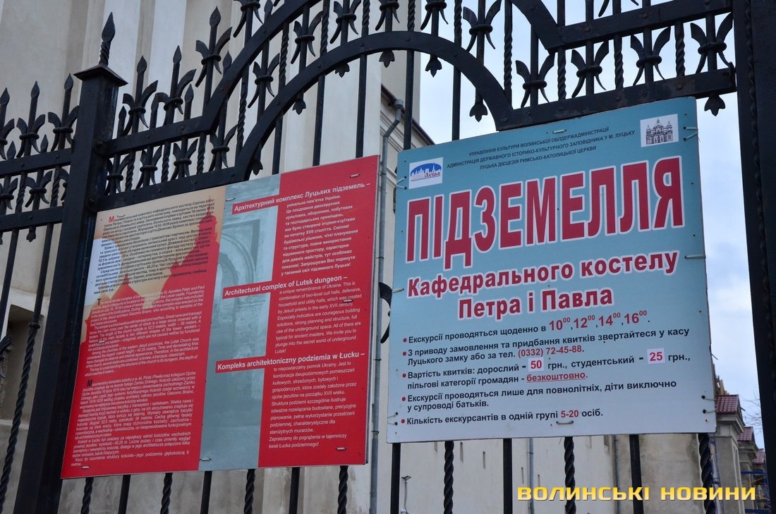 Усі охочі відвідати підземелля кафедрального костелу Святих Апостолів Петра і Павла можуть придбати квиток на екскурсію в касі Луцького замку. Екскурсії відбуваються щодня о 10.00, 12.00, 14.00 та 16.00.