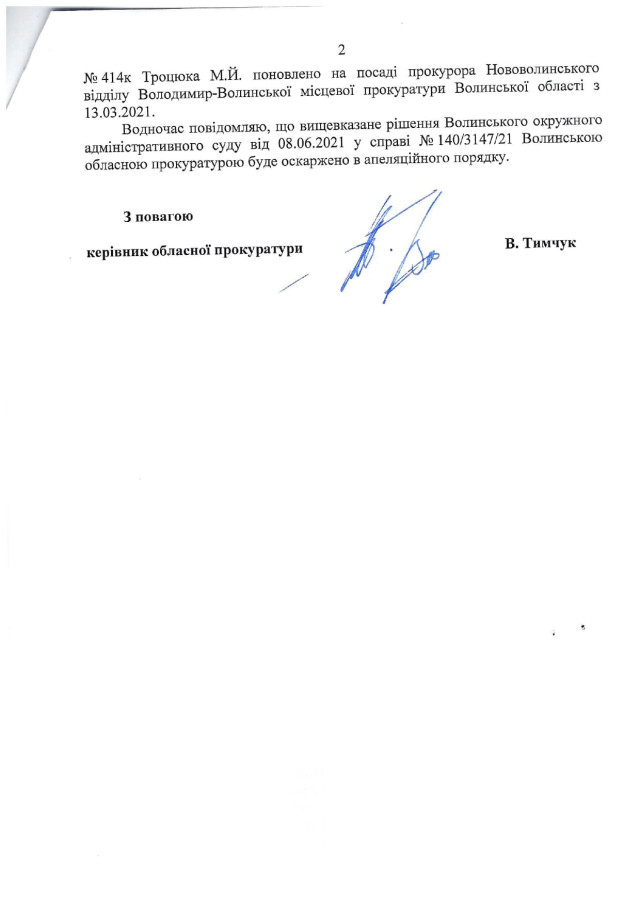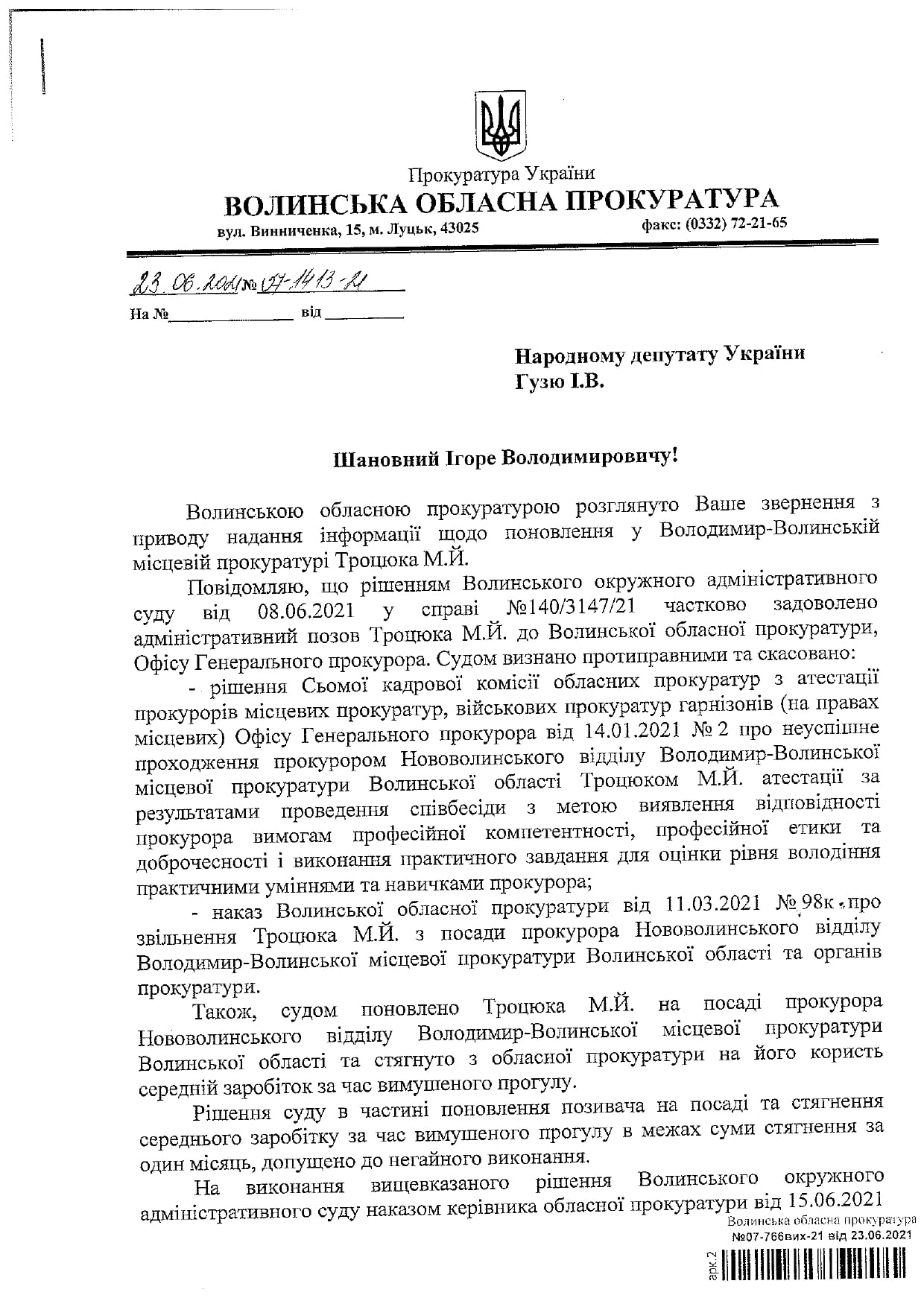 У відповіді від Волинської облпрокуратури йдеться, що рішенням Волинського окружного адмінсуду від 8 червня 2021 року частково задоволено адмінпозов Троцюка М.Й. до Волинської облпрокуратури та Офісу Генпрокурора.