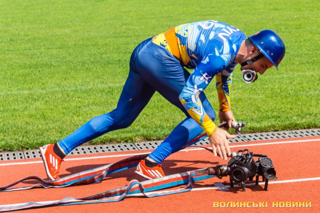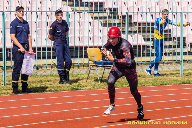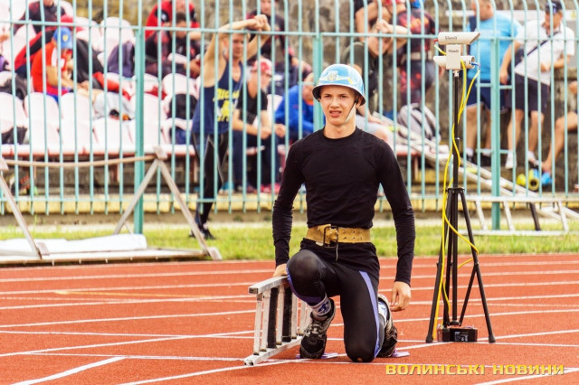 Олександр Андрійчук щойно завершив участь в пожежній естафеті 4х100 метрів. Він – член збірної команди Волині з пожежно-прикладного спорту, має звання заслуженого майстра спорту України з пожежно-прикладного спорту та виступає за збірну України. В активі спортсмена – рекорд Волинської області в подоланні 100-метрової смуги з перешкодами, у підйомі штурмовою драбиною. А також він – ексрекордсмен світу з пожежної естафети.Найважче, зізнається Олександр, – зберегти сили до кінця змагань.