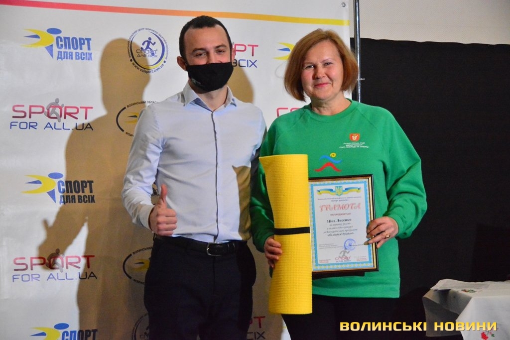 – Провідний професіонал КЗ Луцького міського центру фізичного здоров’я населення «Спорт для всіх» Ніна Лисенко.- Колектив рівненського закладу дошкільної освіти «Світлинка», директор центру молоді, дозвілля, спорту і туризму «Спорт для всіх» Рівненської сільської громади Дмитро Маляс.- Колектив КЗ Луцький міський центр фізичного здоров’я населення «Спорт для всіх» Луцької міської ради в особі директора Наталії Назарук.За активну пропаганду здорового способу життя та популяризацію рухової активності та участь у рейтингу заходів за Всеукраїнськими програмами, відзнаки отримали: