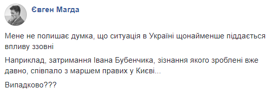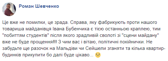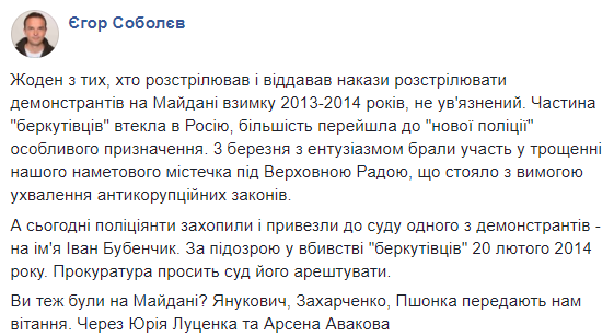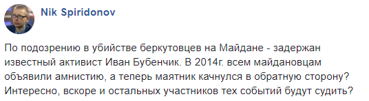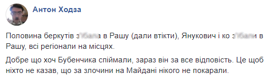 Блогер Антон Ходза з відчутним сарказмом зазначив, що Бубенчика спіймали задля того, аби потім ніхто не сказав, що за злочини на Майдані нікого не покарали.