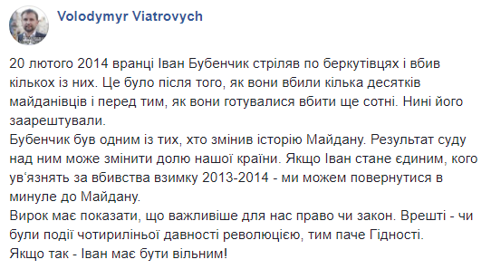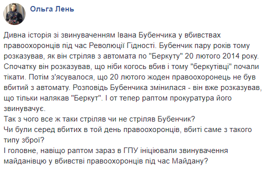 Як писав у Фейсбуці один з адвокатів сімей Небесної сотні Віталій Титич, посилаючись на матеріали кримінальної справи, Іван Бубенчик, підозрюваний у вбивстві беркутівців в 2014 році, стріляв «з метою зірвати перемир'я».