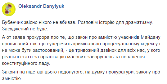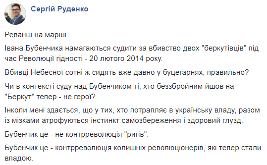 Директор Інституту національної пам’яті Володимир В’ятрович переконаний, що Бубенчик був одним із тих, хто змінив історію Майдану, а результат суду над ним може змінити долю нашої країни. Вирок, за словами автора допису, має показати, що для нас важливіше: право чи закон? Блогер Олександр Данилюк впевнений, що заява Луценка про недолугість Закону про амністію учасників Майдану є тривожним дзвіночком для всіх, хто може отримати реальні статті за організацію масових заворушень. Олександре, як кажуть європейці, зберігайте спокій, тут навіть кулемета чистити не треба. Не забувайте, що таку ж статтю можна буде застосувати і до пана Луценка. Не буде ж розумна людина топити свого ж човна.