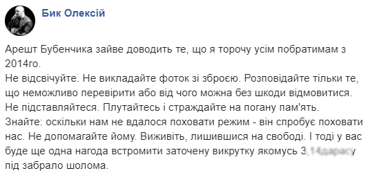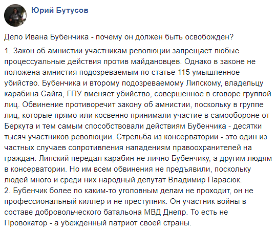 А ось Юрій Бутусов, журналіст і головний редактор порталу «Цензор.Нет» навів цілий перелік причин, чому Іван Бубенчик не має опинитися за ґратами. Зокрема, йдеться про Закон про амністію, відсутність кримінальних справ, неоднозначне інтерв’ю. Тексту багато, тому ставлю його в кінець, для найбільш витриваліших читачів.
