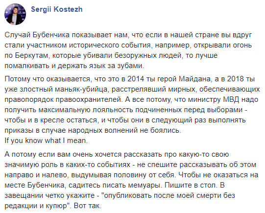 Журналіст Сергій Костеж переконаний, що випадок із Бубенчиком свідчить про те, що не слід хизуватися про участь у якихось важливих історичних подіях, де ви, наприклад, відкривали вогонь, захищаючи людей без зброї. Натомість Костеж пропонує писати мемуари, які можна було б оприлюднити вже після смерті. Ідея прикольна, концепція – як завжди. Краще вже тоді просто мовчати. Сидиш собі у Facebook та й мовчиш. І ніхто не знає, хто ти, що ти.