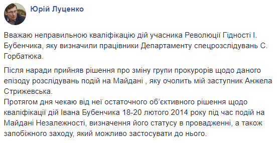 Наступного дня після оголошення Бубенчику про підозру генеральний прокурор країни Юрій Луценко заявив, що вважає неправильною кваліфікацію дій учасника Революції гідності, визначену працівниками Департаменту спецрозслідувань. Ба більше, Луценко змінив групу прокурорів щодо цього епізоду розслідування подій на Майдані.