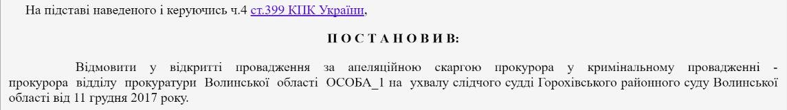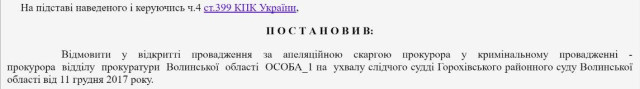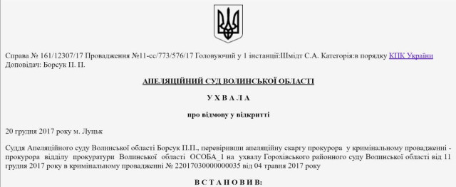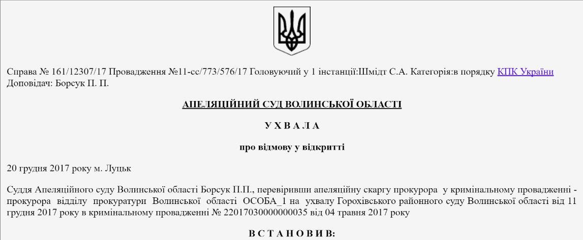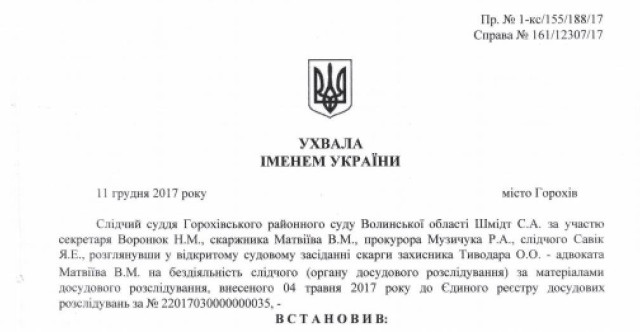 Більше того, на днях стало відомо, що прокурор відділу прокуратури Волинської області подавав апеляційну скаргу на ухвалу слідчого судді Горохівського районного суду Шмідта С. А. від 11.12.2017, яка не підлягає оскарженню та набирає законної сили з моменту її проголошення....Апеляційний суд Волинської області, ухвалою від 20.12.2017 відмовив у відкритті провадження за апеляційною скаргою прокурора на ухвалу слідчого судді, яка частково захищає права Олександра Тиводара....«Чи є чесним, сумлінним і неупередженим виконанням прокурором обов’язків у випадку оскарження ним ухвали, яка згідно з законом не підлягає оскарженню? Чи є це неухильним додержанням Конституції та законів України? Очевидно, що ні! Певен, що багато хто на власному сумному досвіді стикався з подібним чи іншим прокурорсько-слідчим беззаконням.