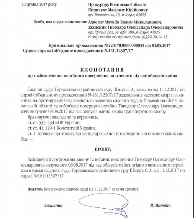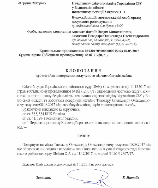 Ще 11 грудня 2017 року слідчий суддя Горохівського районного суду Сергій Шмідт задовольнив скарги захисника та зобов’язав начальника слідчого відділу Управління СБ України у Волинській області чи будь-яку іншу службову особу органу досудового розслідування негайно повернути Олександру Тиводару вилучене під час обшуків майно.