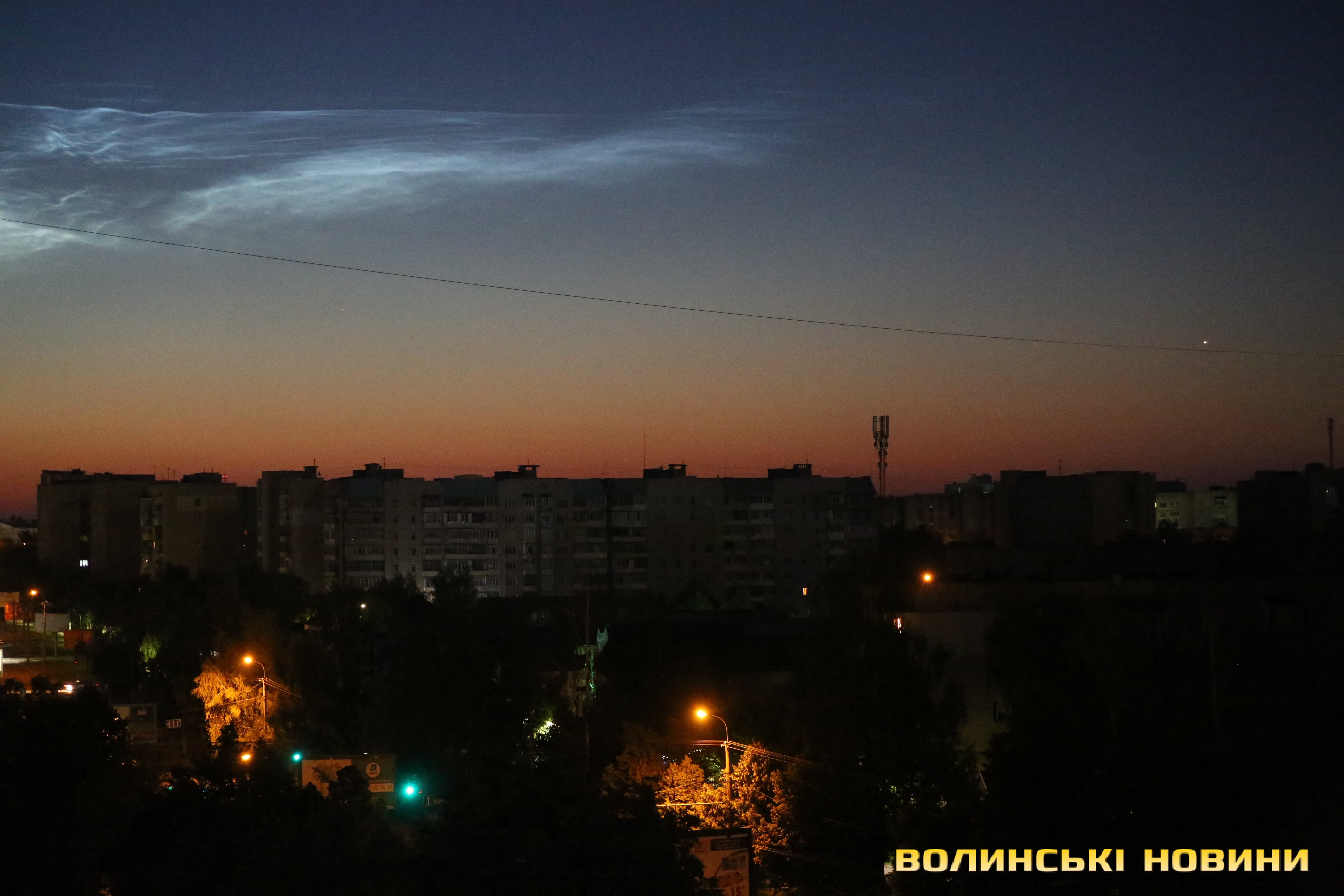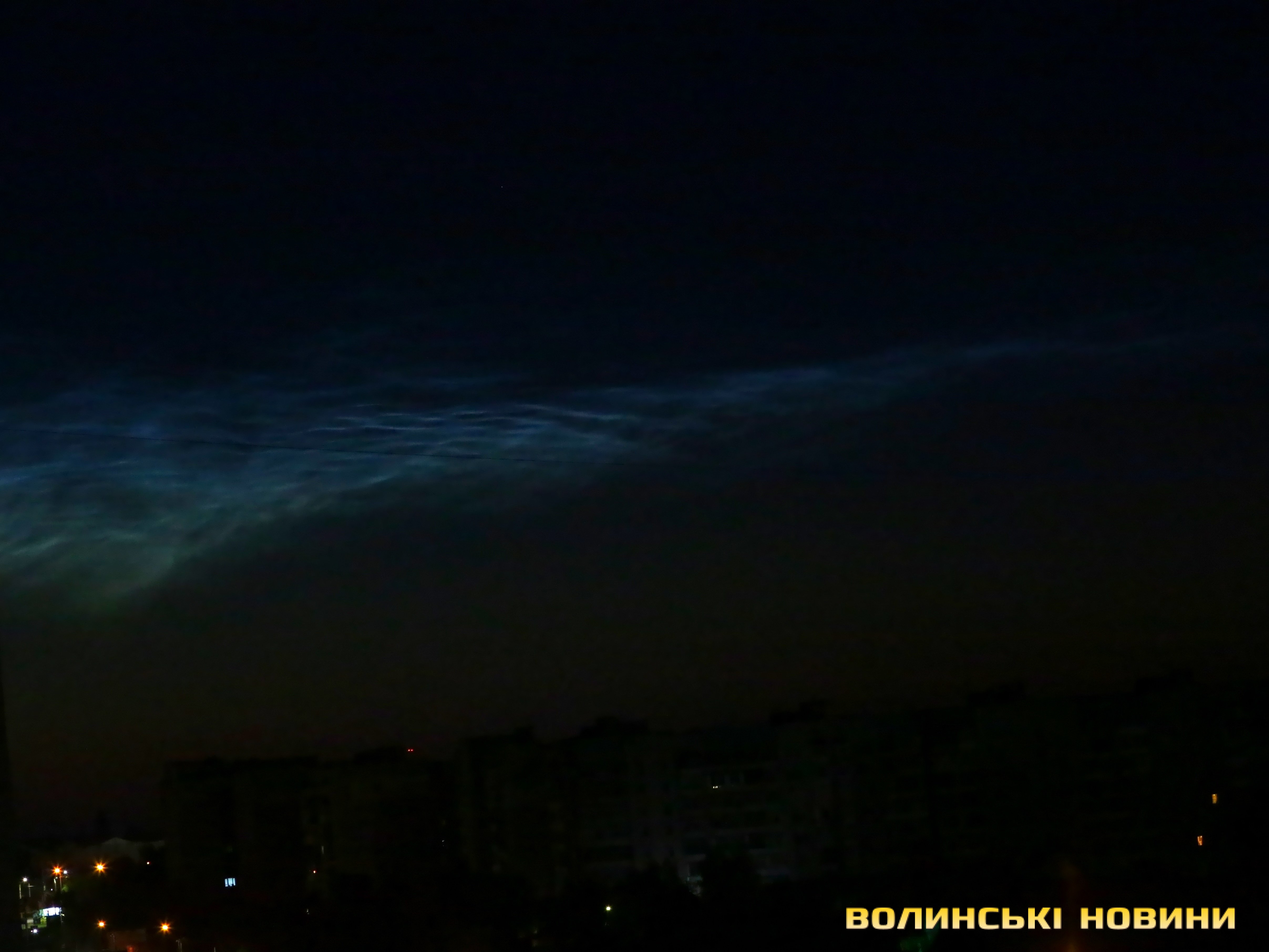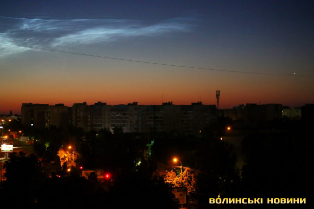 У передсвітанковому небі Луцька вдалося зафіксувати рідкісне для України атмосферне видовище – сріблясті хмари. Це відносно молоде метеорологічне явище, природу якого вчені остаточно так і не дослідили. Прозоре хвилясте мереживо, схоже на хмари, що ніби підсвічуються блакитним неоном, утворюється у мезосфері за досить низьких температур.