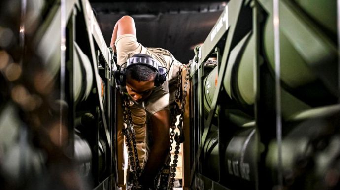 Міноборони США оприлюднило фото, як члени 305-ї ескадрильї повітряного порту на об’єднаній базі Макгуайр-Дікс-Лейкхерст завантажують боєприпаси, що прямують до України.