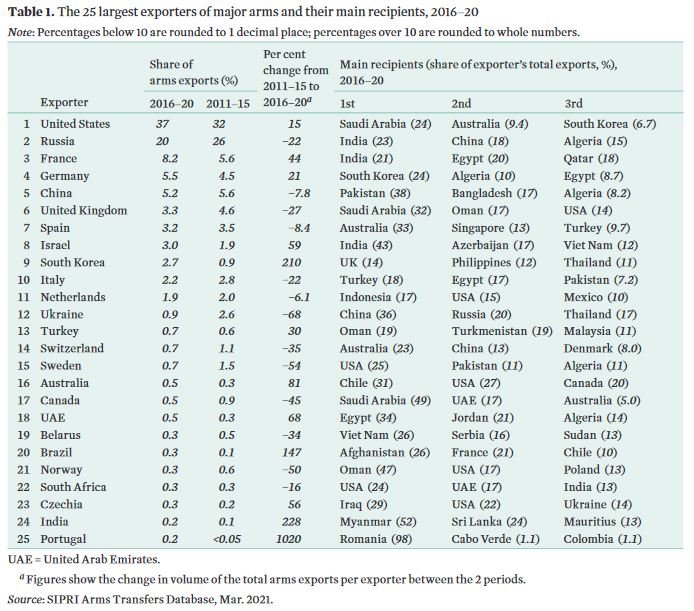 Загалом обсяги міжнародної торгівлі зброєю за період 2016-2020 роки у порівнянні з показниками за попередні п'ять років не змінилися. До топ-5 найбільших експортерів зброї у світі входять США, Росія, Франція, Німеччина і Китай. На них у сукупності припадало 76% всього експорту озброєння в 2016-2020 роках.При цьому частка американського експорту у світовій торгівлі зброєю за вказаний термін зросла з 32% до 37%. Половину з цього озброєння США передали на Близький Схід.