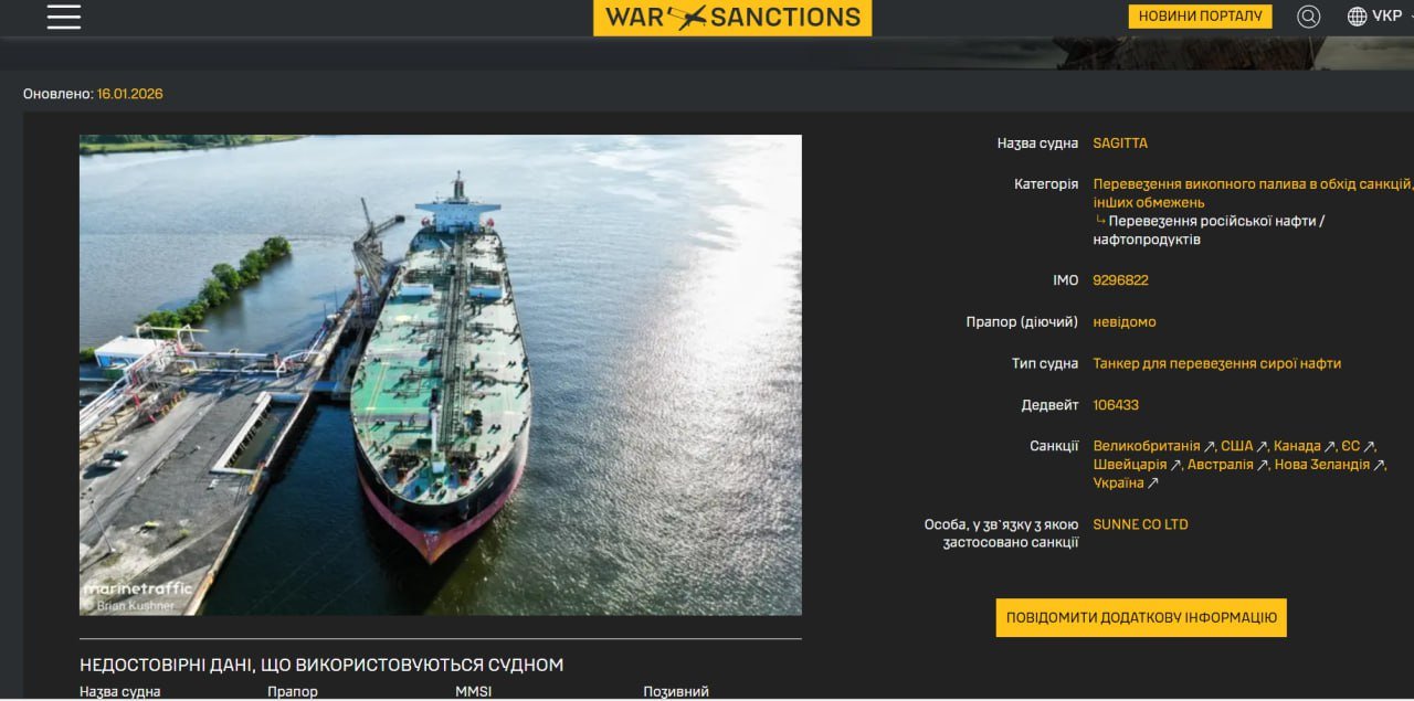 За даними Головного управління розвідки Міністерства оборони України, Sagitta – судно тіньового флоту РФ. Воно перебуває під санкціями України, Європейського Союзу, США, Великої Британії, Канади, Швейцірії, Австралії та Нової Зеландії.