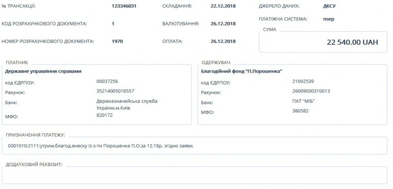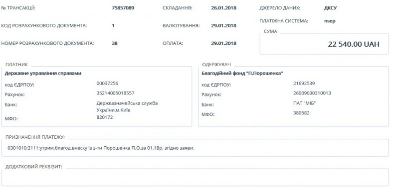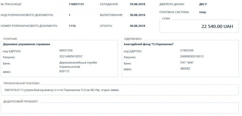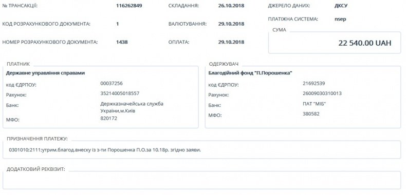 Таким чином, всього за час президентства Порошенко повинен був перерахувати зі своєї зарплати своєму благодійному фонду близько 1 млн гривень.