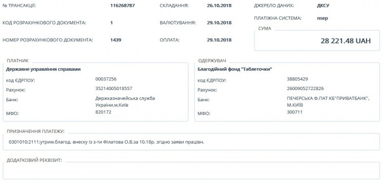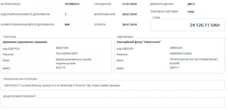 При цьому заступник глави Адміністрації Президента Олексій Філатов, який також віддає всю свою зарплату на благодійні цілі, перераховує її благодійному фонду «Таблеточки», який надає допомогу онкохворим дітям.