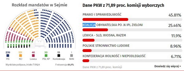 У такій ситуації кінцевий результат партії влади не повинен дивувати. Згідно з даними екзитполів, PiS підтримали 43,6% виборців, що дозволяє отримати у Сеймі 239 мандатів із 460.