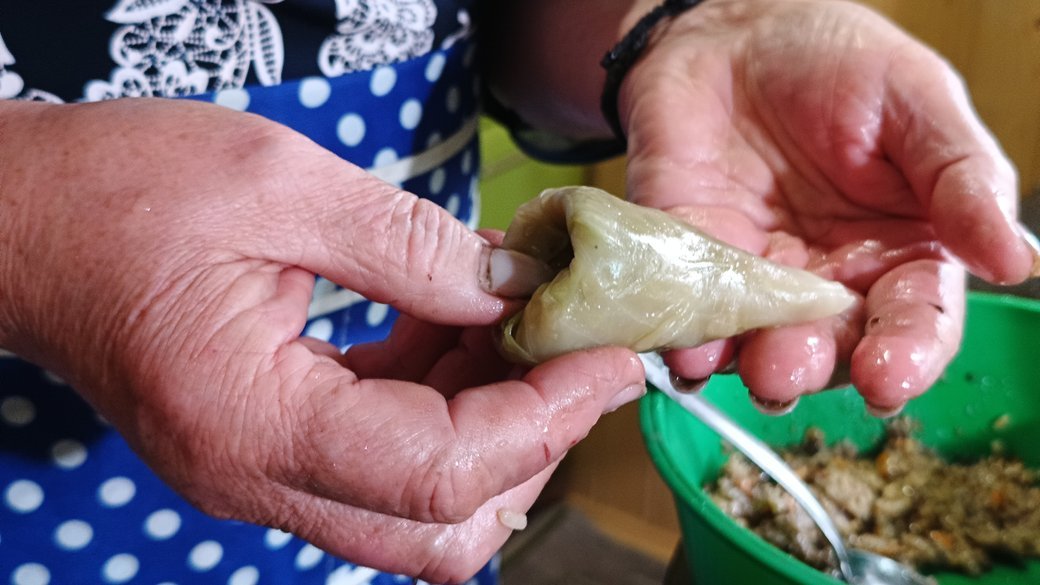 «На склянку рису даю пів літра перекручених грибів. Дві-три морквинки, дві-три цибулинки. Як тушкуються голубці, то заливаю настоєм з грибів сухих, він додає насиченого грибного смаку й аромату», – каже жінка.Начинку загортає у відварені листки капусти. Здебільшого листок розділяє навпіл, щоб голубці були невеличкими.