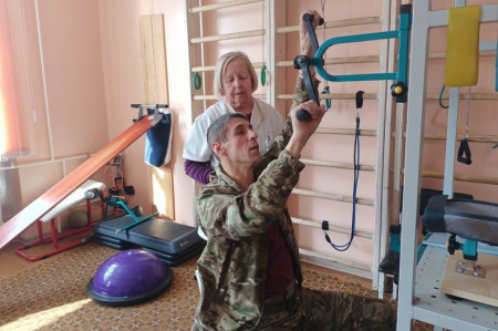 «Він як прийшов, то взагалі не міг підіймати руку, біль була, рука навіть до 90 градусів не підіймалася. А зараз вже бачте як...», – каже медсестра реабілітаційного відділення Віра Комарова, яка допомагає Олександру.