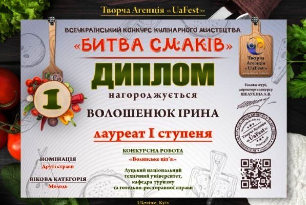 Студентка освітньої програми «Готельно-ресторанна справа» Луцького національного технічного університету Ірина Волошенюк стала лауреатом Всеукраїнського конкурсу кулінарного мистецтва «Битва смаків».
