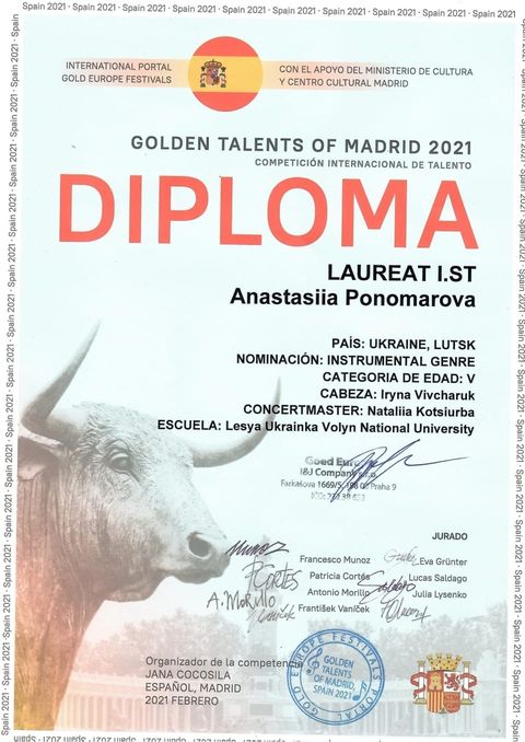 Студентка Волинського національного університету імені Лесі Українки Анастасія Пономарьова здобула 1 місце у Міжнародному конкурсі-фестивалі «Золоті таланти Мадриду 2021».
