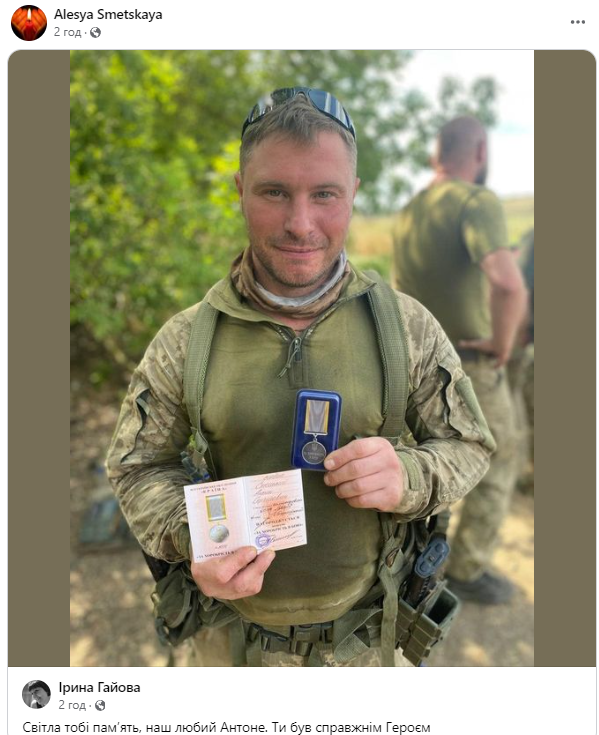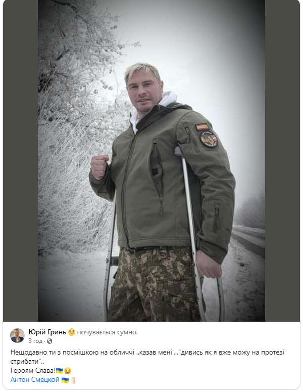 «Вічна пам’ять герою. Як боляче, коли ідуть найкращі... Загинув, виконуючи бойове завдання, Антон Смецький. Антон пішов на фронт з початку війни. Він втратив ногу, зробив протезування та пішов знову, хоча мав змогу і не іти. Але він просто не зміг залишити своїх побратимів та свою країну! Дуже болюча втрата. Світла памʼять, Антоне! Герой, гідний своєї Батьківщини», – йдеться у дописі.