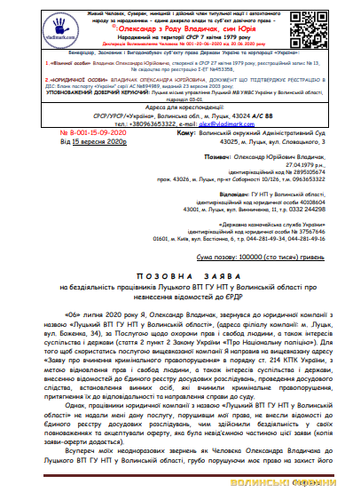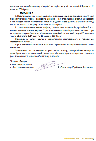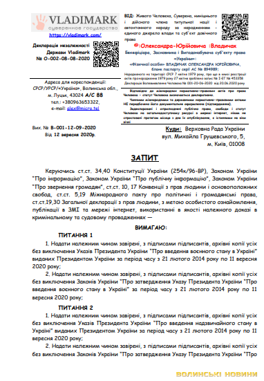 Жарти жартами, але також чоловік публікував запит, в якому просив надати належним чином завірені, з підписами підписантів архівні копії усіх без виключення Указів Президента України «Про введення воєнного стану в Україні» виданих Президентом України за період часу з 21 лютого 2014 року до 11 вересня 2020 року.Також «человєк» Олександр Владичак публікував багатосторінкову позовну заяву на бездіяльність працівників Луцького ВП ГУ НП у Волинській області про невнесення відомостей до ЄРДР, просивши стягнути 100 тисяч гривень.Як розповідає Лідія Іванова, весною минулого року правоохоронці все ж вибили Олександру Владичаку двері, винесли його в трусах на вулицю та впакували в автомобіль. Через кілька місяців чоловік повернувся до власного житла, але сайту «vladimark.com» уже не було.