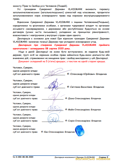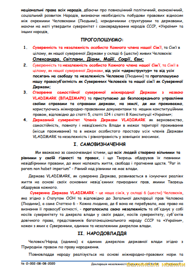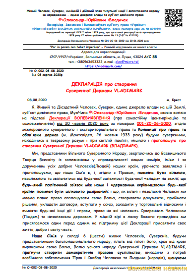 У відповіді СБУ лучанці силовики заявляли, що в межах підсудності вживаються заходи, у тому числі процесуального характеру, щодо протидії протиправним посяганням на життєво важливі інтереси української держави.У «Декларації про створення Суверенної Держави VLADIMARK» йдеться таке: «Я, Живий та Дієздатний Человєк, Суверен, єдине джерело влади на цій Землі, суб'єкт довічного права, МужЧина ©:Олександр-Юрійович :Владичак, своєю волею на підставі Декларації ВОЛЕВИЯВЛЕННЯ (про самостійну ідентифікацію та самовизначення) від 20 червня 2020 року за номером 001-20-06-2020, згідно міжнародного суверенного і екстериторіального права та Конвенції про права та обов'язки держав (м. Монтевідео, 26 жовтня 1933 року) будучи суверенним, находячись у тверезому розумі і при світлій пам’яті, ініціюю і проголошую про створення Суверенної Держави VLADIMARK (ВЛАДІМАРК)».Зокрема чоловік проголошує незалежність для всіх человєків-членів його сім’ї, які й підписали цю «декларацію». Серед пунктів так званої декларації – самовизначення, народовладдя, державна влада, громадянство, територіальне верховенство, економічна самостійність, зовнішня і внутрішня безпека, міжнародні відносини.