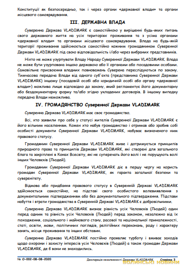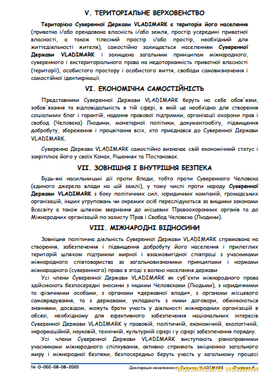 Особливо цікавим є пункт «територіальне верховенство», в якому йдеться про те, що «територією Суверенної Держави VLADIMARK є територія його населення (приватна і/або орендована власність і/або земля, простір усередині приватної власності, а також тілесний простір і/або простір, необхідний для життєдіяльності жителя), самостійно захищається населенням Суверенної Держави VLADIMARK і захищена загальним принципам міжнародного, суверенного й екстериторіального права на недоторканність приватної власності (території), особистого простору і особистого життя, свободи самовизначення і самостійної ідентифікації».