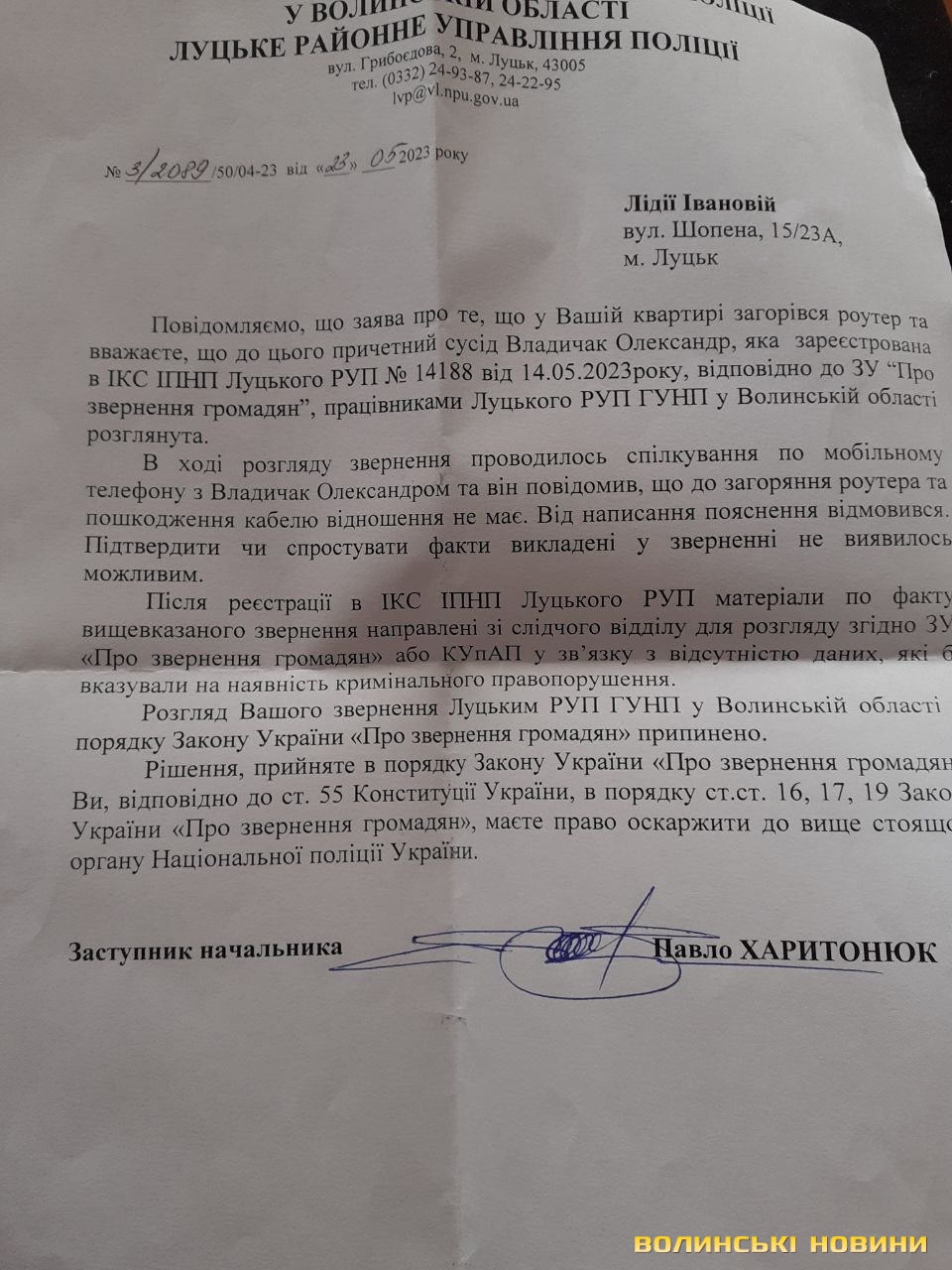«В ході розгляду звернення проводилось спілкування по мобільному телефону з Владичаком Олександром та він повідомив, що до загоряння роутера та пошкодження кабелю відношення не має. Від написання пояснення відмовився. Підтвердити чи спростувати факти викладені у зверненні не виявилося можливим», – йдеться у відповіді правоохоронців.У підсумку в поліції припинили розгляд чергового звернення Лідія Іванової. Лучанка не здивована такої відповіддю, говорячи, що ці її заяви не мають жодної сили. Вона каже, що не знає, до кого звертатися, стверджуючи, що її сім’ю хочуть вбити, спаливши оселю.