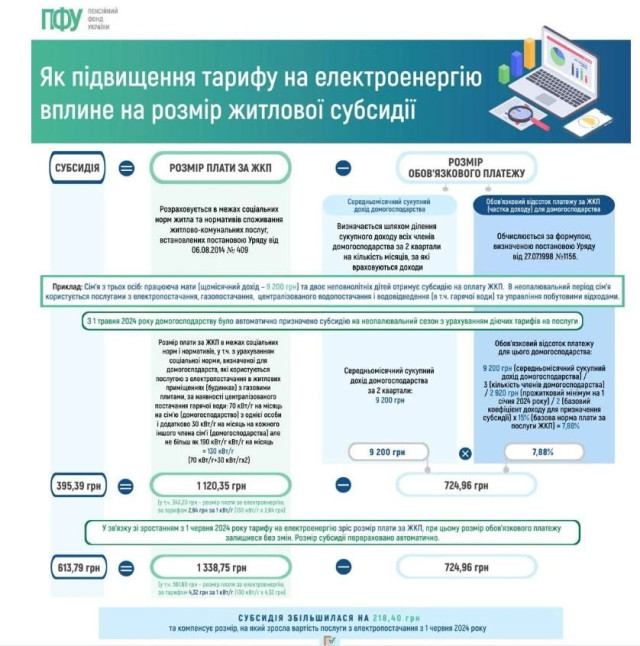 У ПФУ для прикладу підрахували, що сім’я з трьох осіб (працююча мати із щомісячним доходом 9200 грн та двоє неповнолітніх дітей) після перерахунку додатково отримає до субсидії 218,4 грн.Водночас у Пенсійному фонді нагадали, що житлова субсидія розраховується індивідуально для кожного домогосподарства з урахування переліку та вартості ЖКП та кількості членів домогосподарства.
