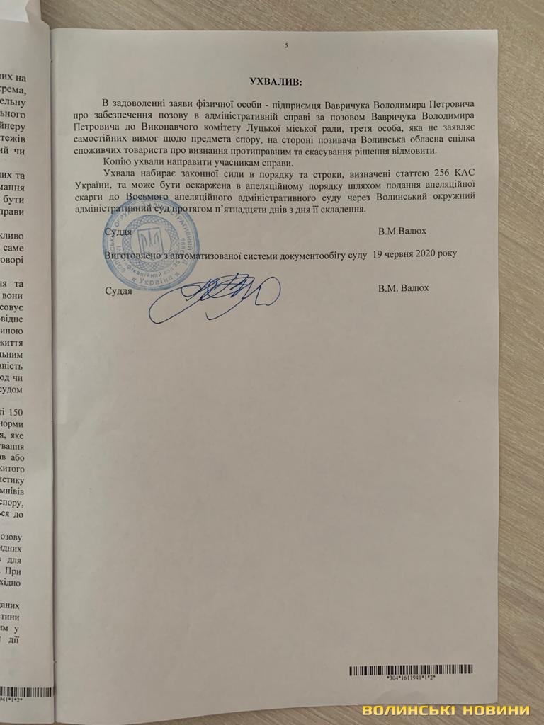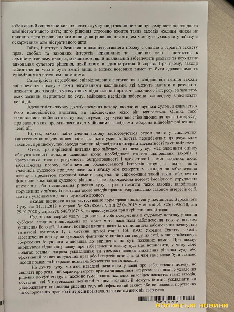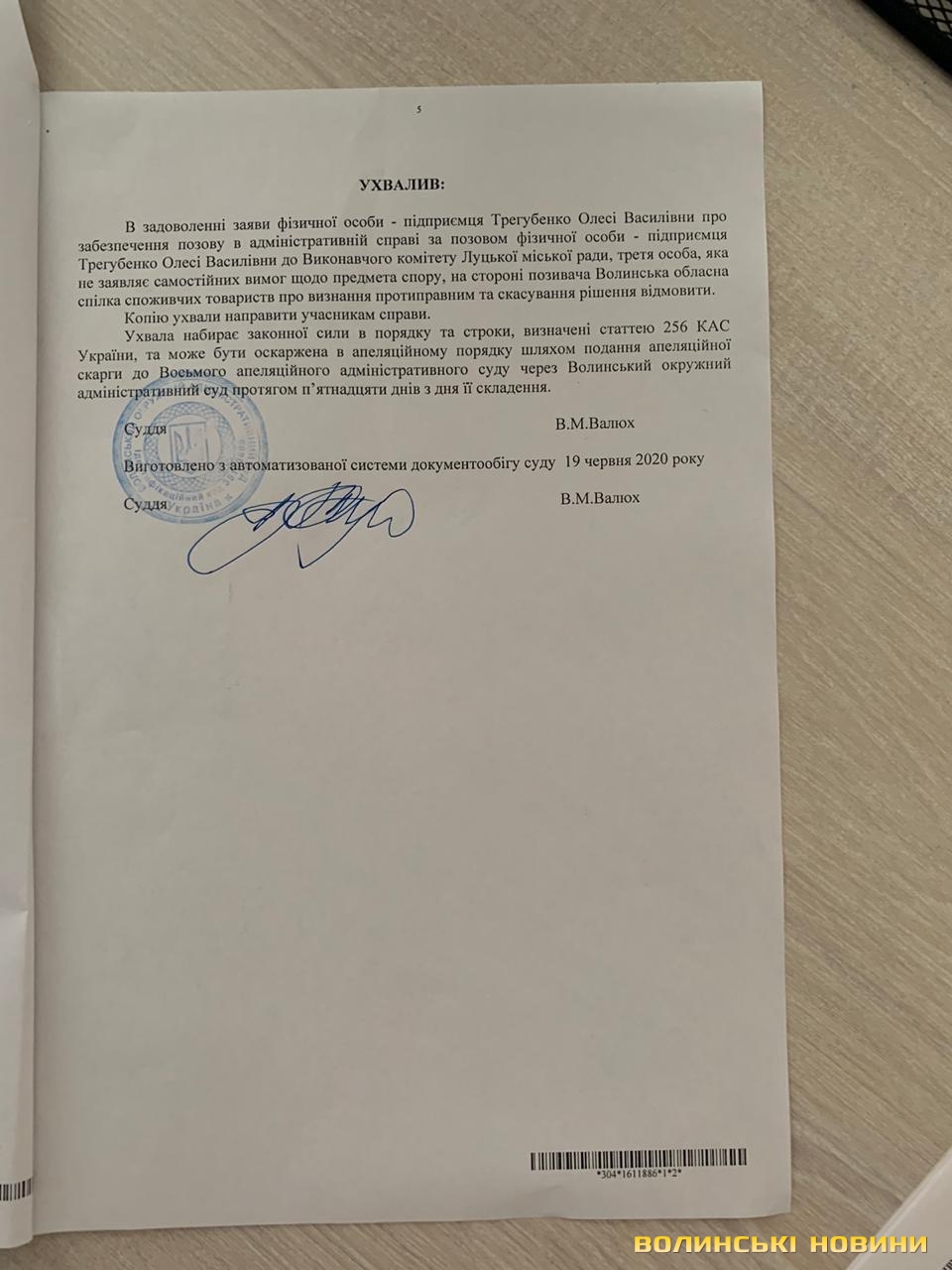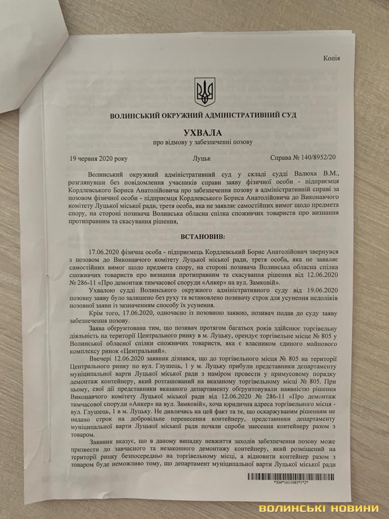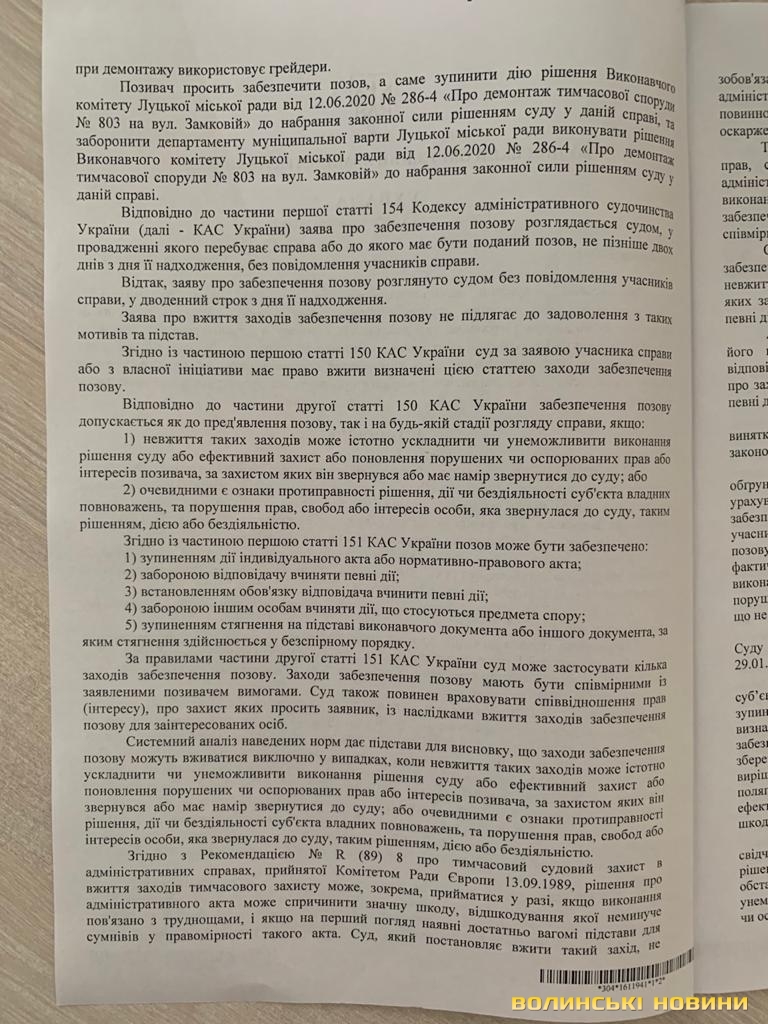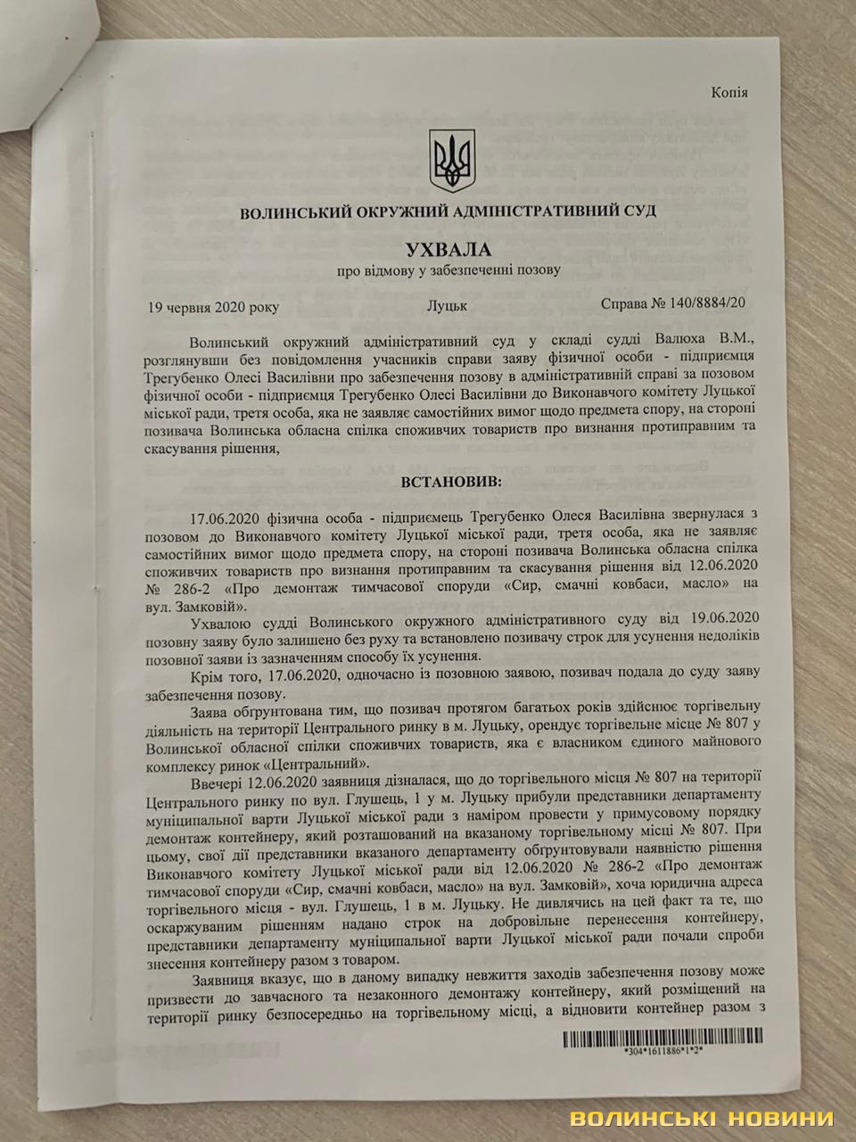Сім підприємців Центрального ринку звернулись у Волинський окружний адміністративний суд з клопотаннями про забезпечення позову, в яких просили заборонити зносити торгові об’єкти, які підлягають демонтажу, до прийняття судом рішення по суті. Всім їм суд відмовив у забезпеченні позову.