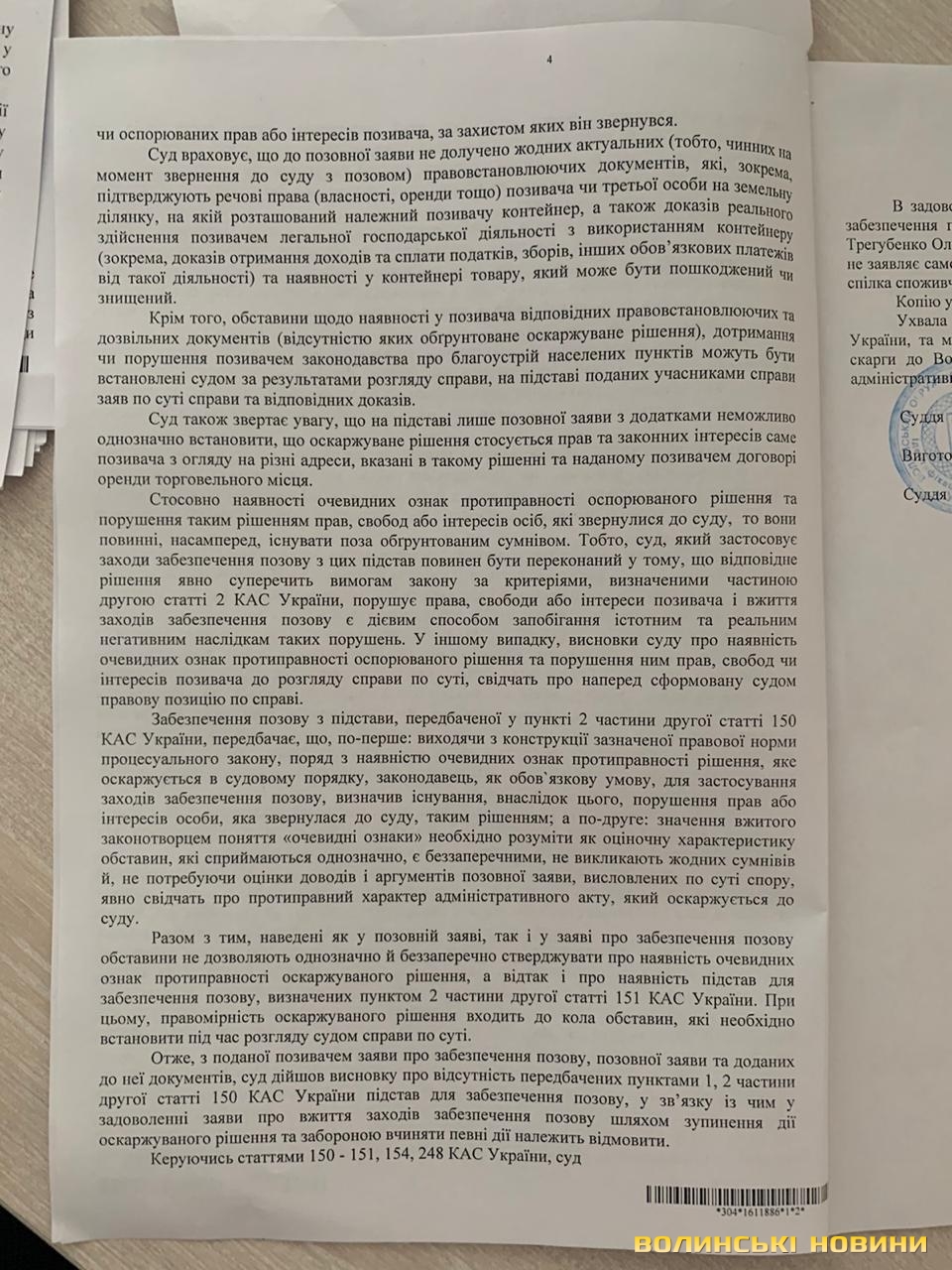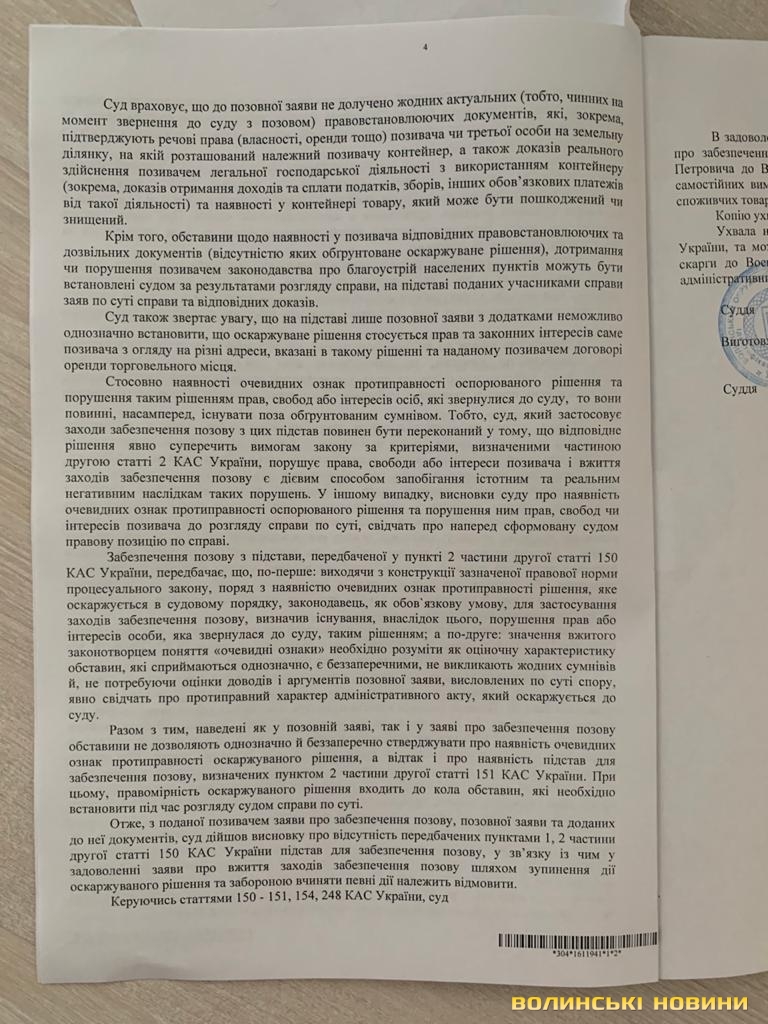 Як йдеться в документі, позивачі просили зупини дію рішення виконкому, відповідно до якого їхні контейнери підлягали демонтажу, адже встановлені незаконно.