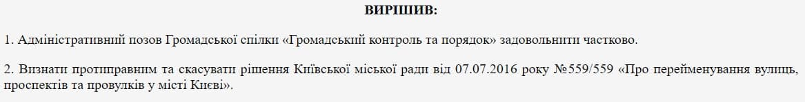Окружний адміністративний суд міста Києва постановив визнати протиправним і скасувати рішення Київської міської ради від 07.07.2016 року № 559 / 559 «Про перейменування вулиць, проспектів і провулків у місті Києві».